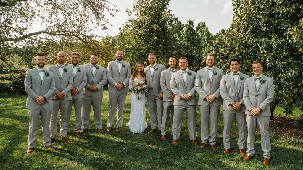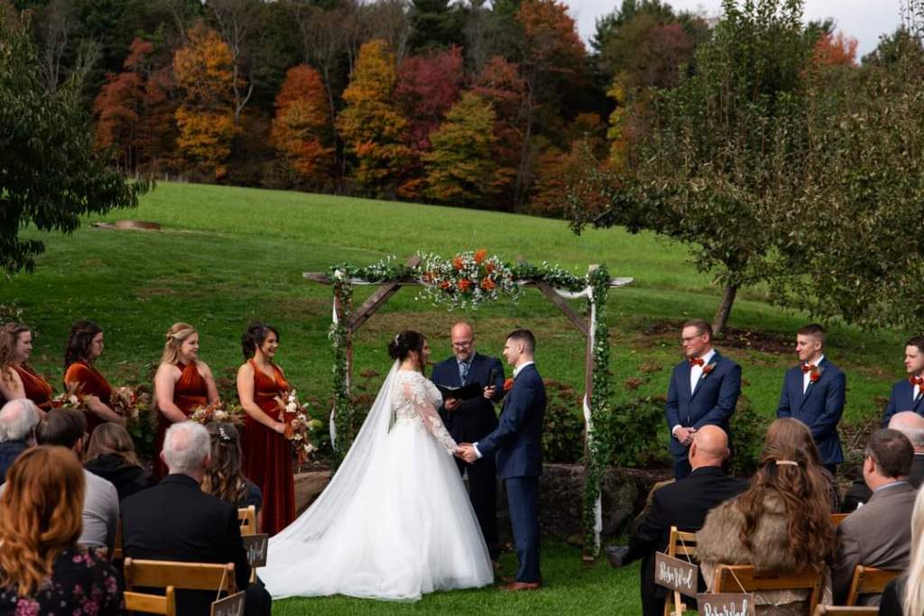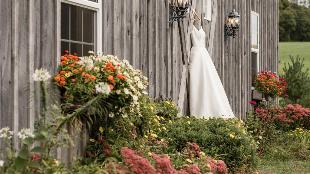 The Orchard on the west side of the barn is a favorite spot for ceremonies and pictures. A retaining wall cut into the hill provides a backdrop for ceremonies framed by peach and pear trees and the large crabapple and fence line perennials offer a lovely spot for photos. Another relaxing view can be had from the top of the orchard at the fire ring which can be used at the reception or rehearsal.
