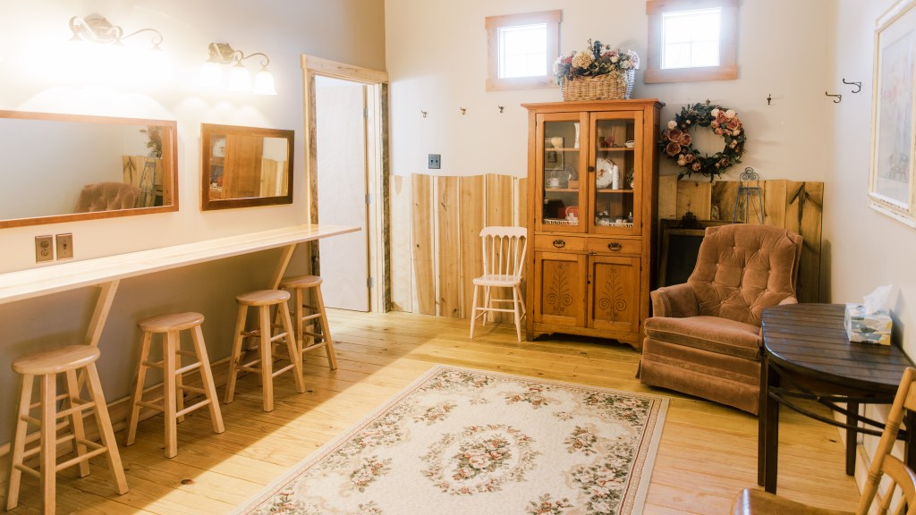 The Groom’s Room is nestled away about 50 yards from the barn where the guys can hang out inside or out in the courtyard. The room itself has places to hang clothes, mirrors and its own bathroom. It also has heating and air-conditioning.